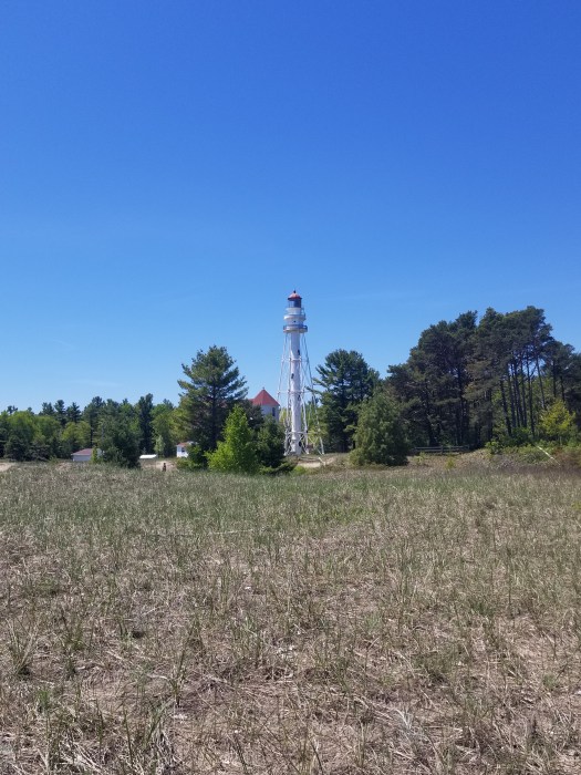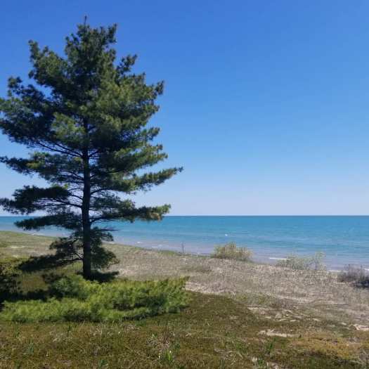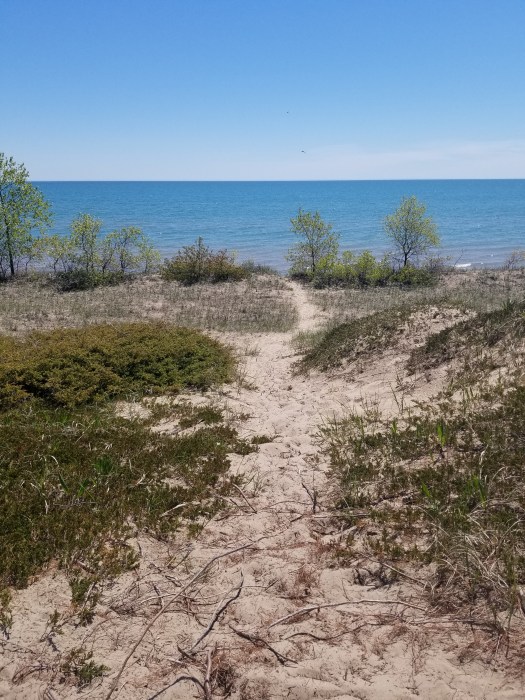 The forest trail butts up to the beaches of the state forest, and it is a quick climb over a few sand dunes to get to Lake Michigan. I look around and the sky is a brilliant jewel blue, there are pelicans bobbing in the waves just off-shore, and I have an entire stretch of beach to myself.